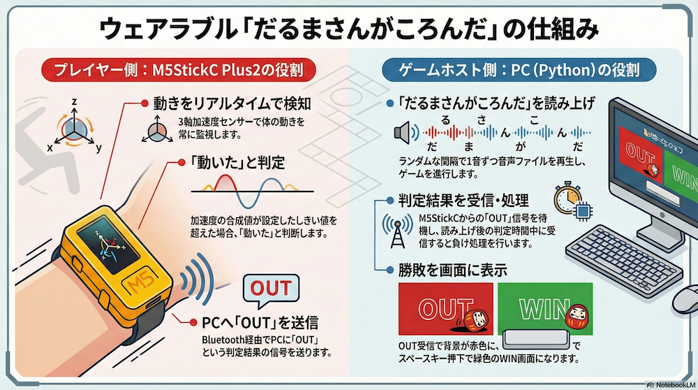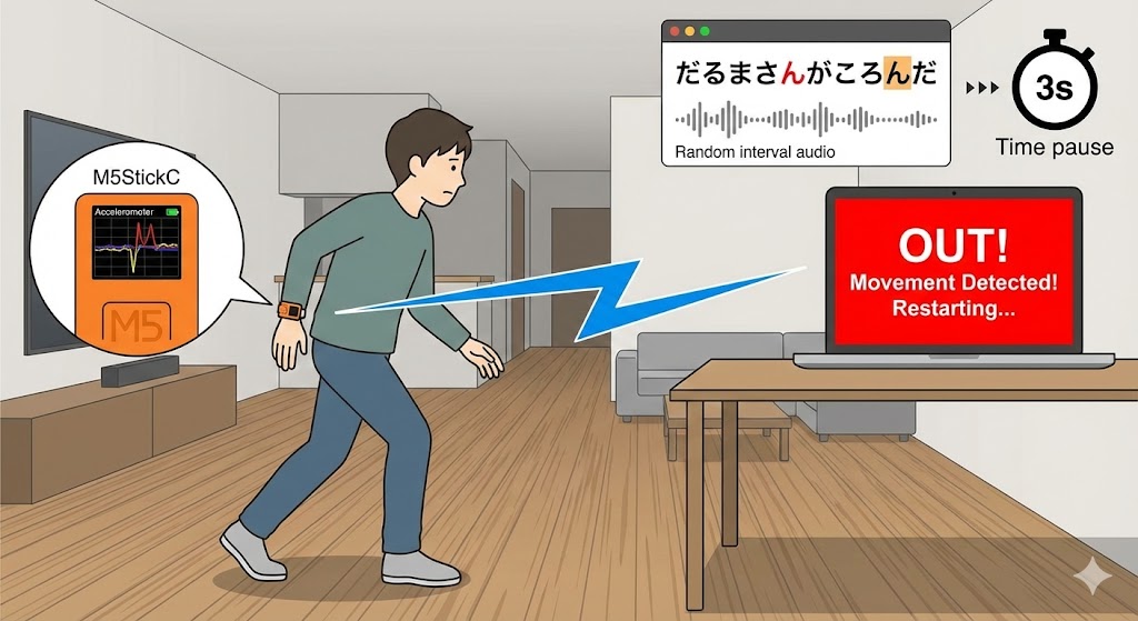 ・動いたとみなしたら、M5からPCにBluetooth経由で合図を送る。例えば番号など。この場合ユーザの負け。最初から。