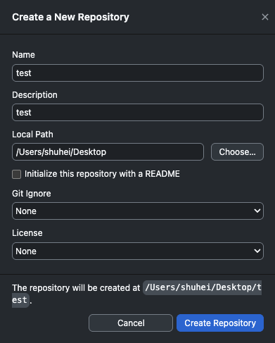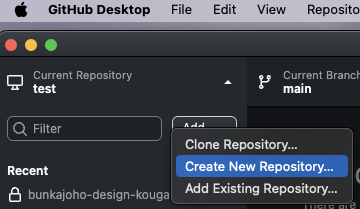 - メニューバーから File → New repository… を選択します。(もしくは左上のCurrent Repository→Ade → Create New repository でもOK)