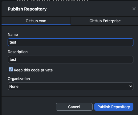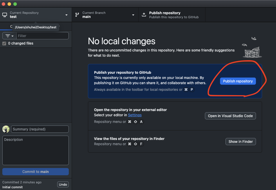 - Publish Repository を押すと、GitHub 上にリモートリポジトリが作成されます。(View on Githubを押せばリポジトリを確認できます)