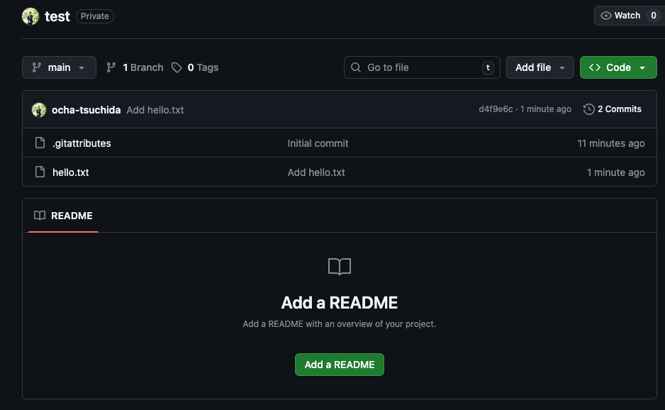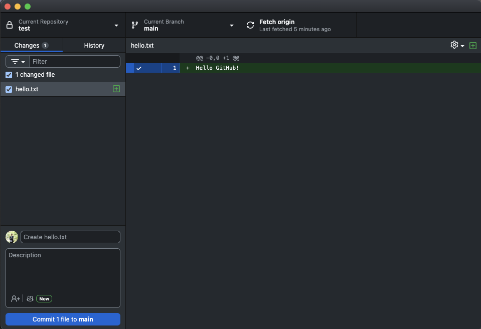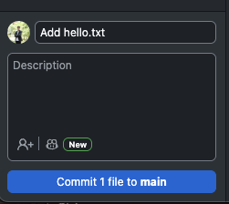 "Add hello.txt"。まあ適当でいいです)。 - 必要であれば Description にも詳細を記述します。