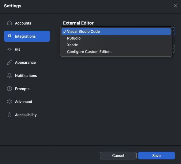 GitHub Desktop から直接 Visual Studio Code(VS Code)を開けるように設定すると便利です。