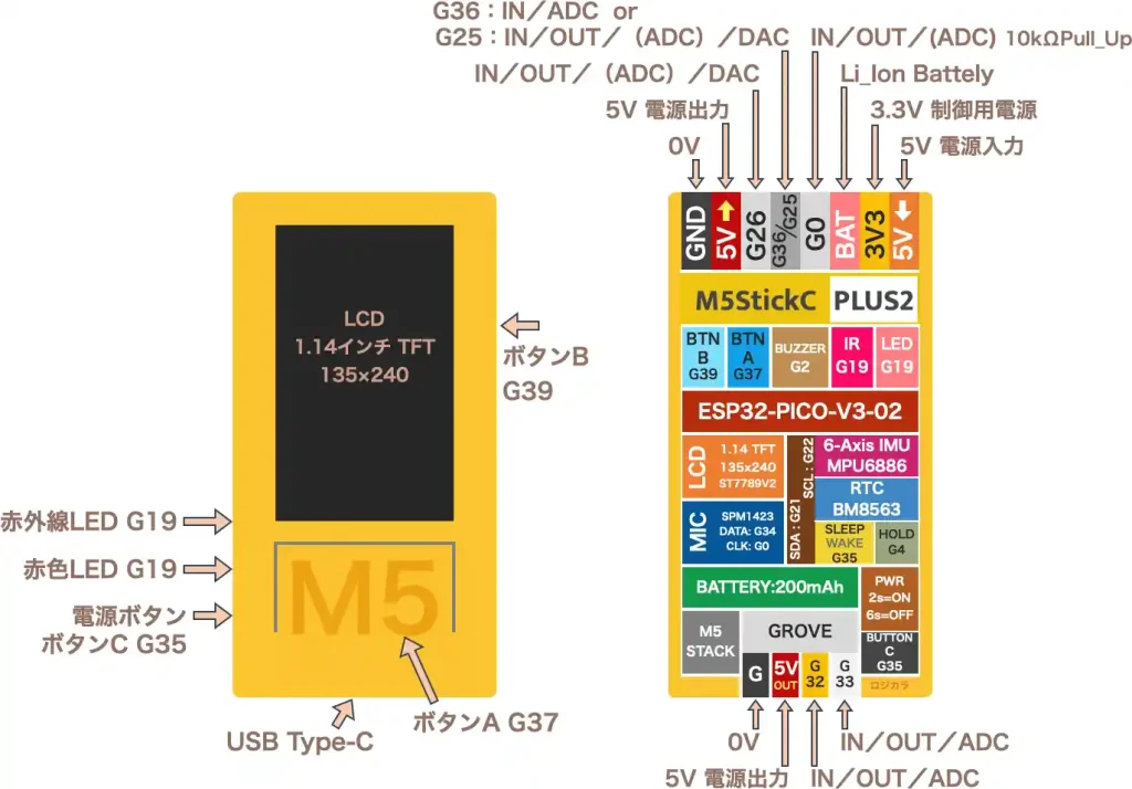 これから扱うM5StickC Plus2(M5シリーズ) は、その配線と周辺機能の多くを最初から内蔵したモジュール群です。