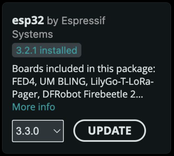 esp32を検索し、esp32 byEspressif Systemsをインストール。(※ 3~4分かかります)- Macのみ注意:3.2.1のバージョンに変更しないと”m5unified.cpp ‘touch_pad_init’ was not declared in this scope” というエラーが出るようです。