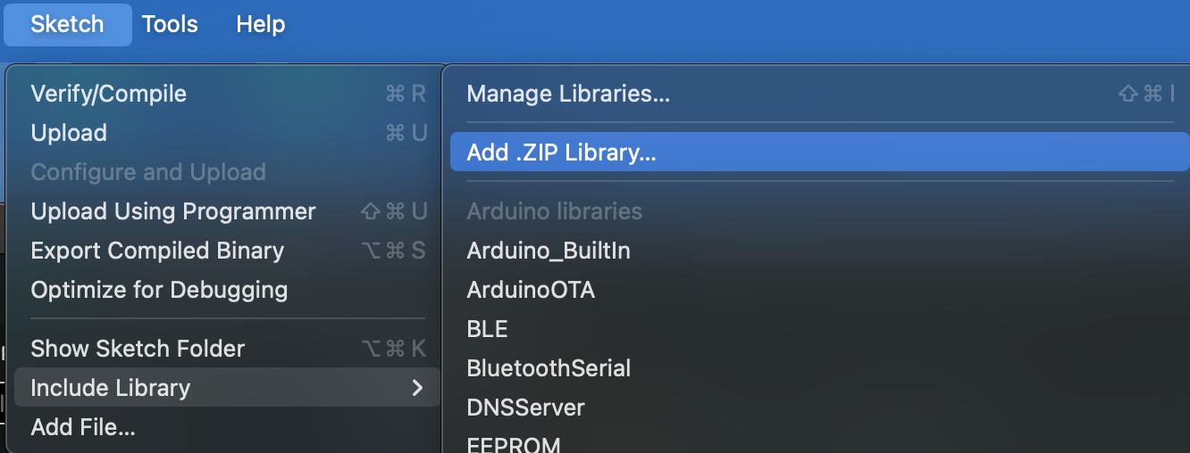 [Sketch] → [Inclide Library] → [Add .ZIP Library...]