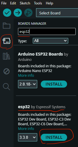 - 左側のアイコンからボードマネージャを開く(上から二番目)( or [ツール] → [ボード] → [ボードマネージャ] を開く。)