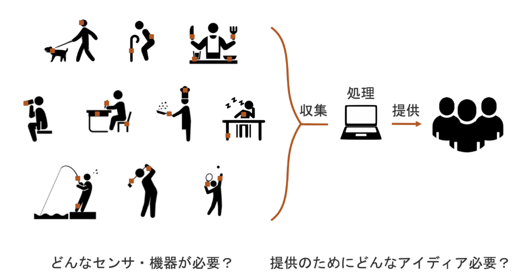 現実世界にセンサや小さな機器を置く/身につけることで、これまで流れ去っていた活動をデータとして捉え直す。この「計測の設計と実装」が、他に簡単には真似できない価値を生む可能性があります。