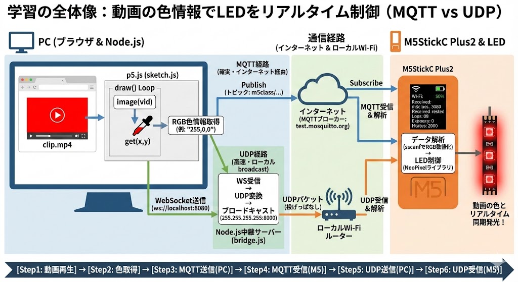 「PCで再生する動画の色をリアルタイムで取得し、M5StickC Plus2のLEDを光らせるプログラムを完成させる。最終的には、全員のLEDを一つの動画に同期させて光らせる体験をすること。」