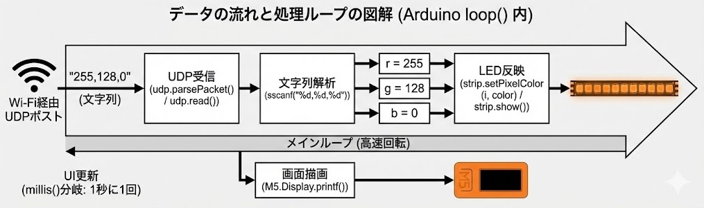 高速な反応を実現するため、loop() の中に delay(1000) のような「処理を止める命令」を書くのは厳禁です。止まっている間に飛んできたUDPパケットを取りこぼしてしまうからです。 そのため、millis() (起動してからの経過時間)を使って、「1秒経った時だけ画面を更新する」という書き方をしています。これにより、LEDの制御を止めることなく、画面情報の更新を行っています。