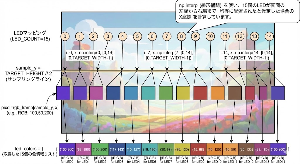 np.interp (線形補間) を使い、15個のLEDが画面の左端から右端まで均等に配置されたと仮定した場合の X座標 を計算しています。