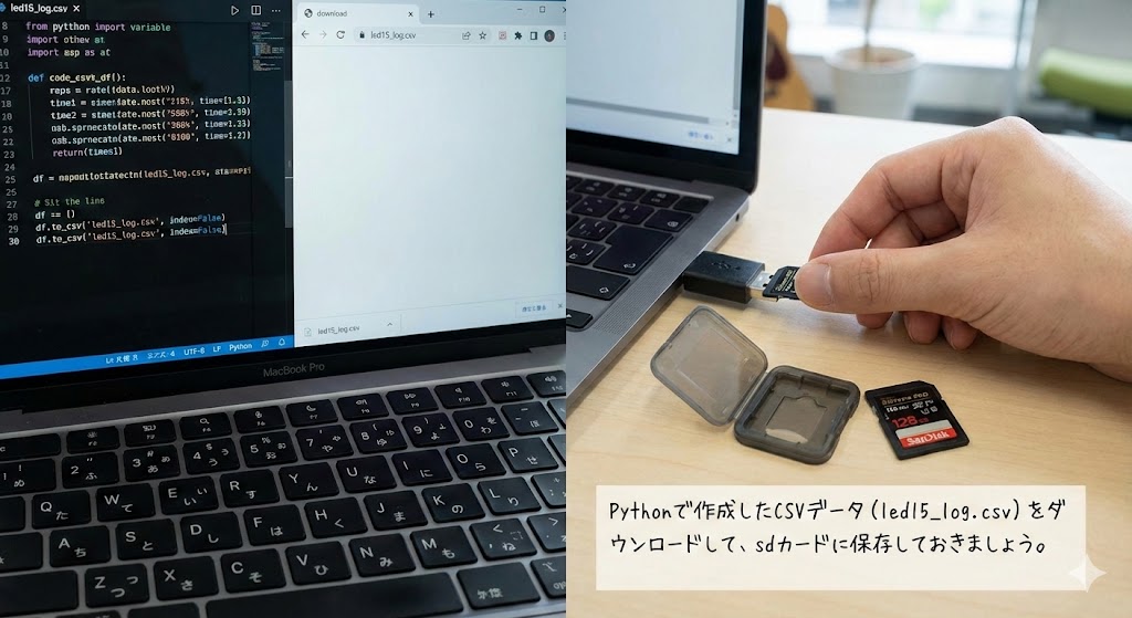 それでは、作成したCSVデータ(led15_log.csv)をダウンロードして、sdカードに保存しておきましょう。