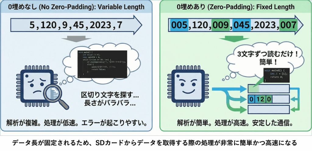 - これにより、M5StickCのようなマイコン側でデータを受信する際、文字読み取りの処理が非常に簡単かつ高速になります。