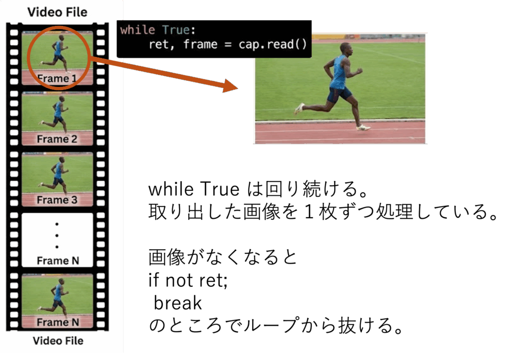cap.read() は動画の先頭から1コマずつ画像を読み込みます。これを While ループで回すことで、動画の全ての瞬間を逃さず処理します。