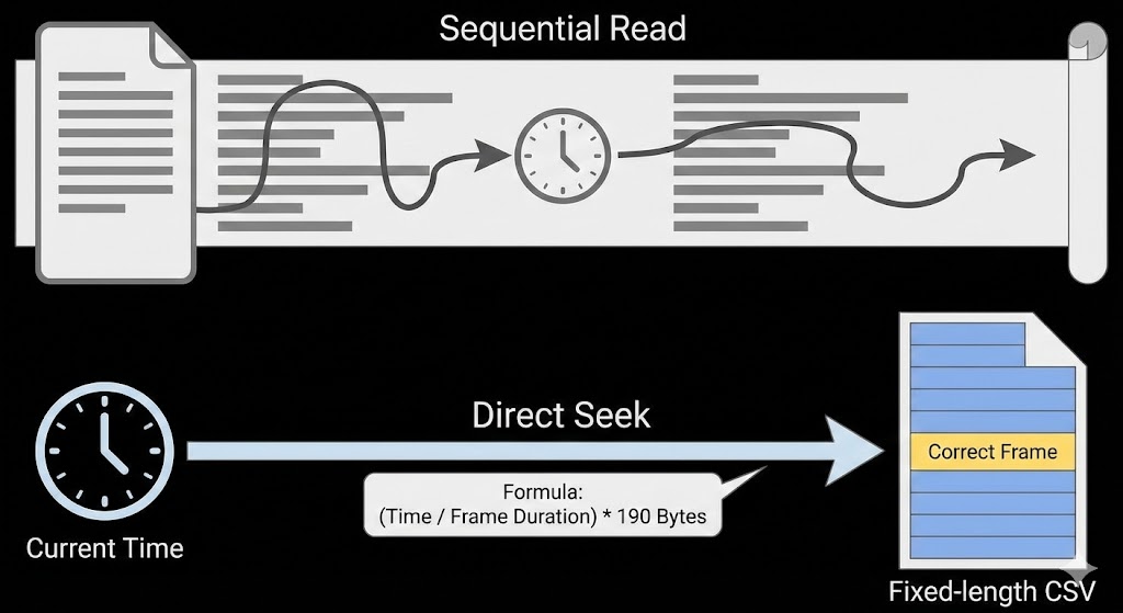 - 「固定長CSV」 の特性を活かし、ファイルの最初から順番に読むのではなく、「今の時間に必要な行」へ一瞬でワープ(seek)する 技術を学ぶ。