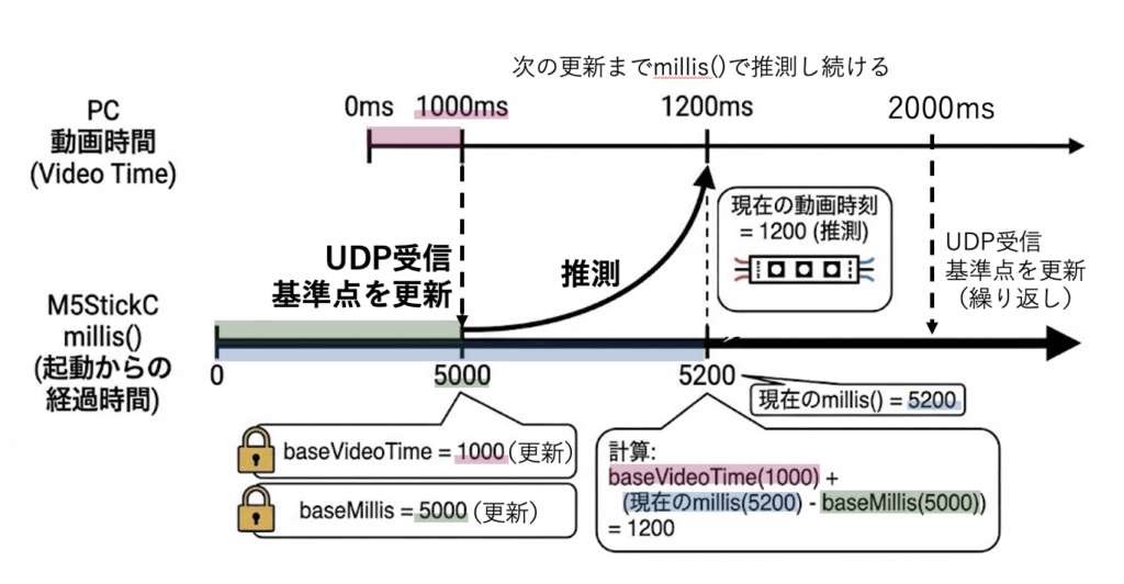 前回のStep3ではM5StickC単体での再生を行いましたが、Step4ではいよいよPC(p5.js)と連携させます。 PC側で再生している動画の「現在時刻」を、Wi-Fi(UDP通信)を経由してM5StickCに通知し、ズレを自動補正するシステムを構築します。