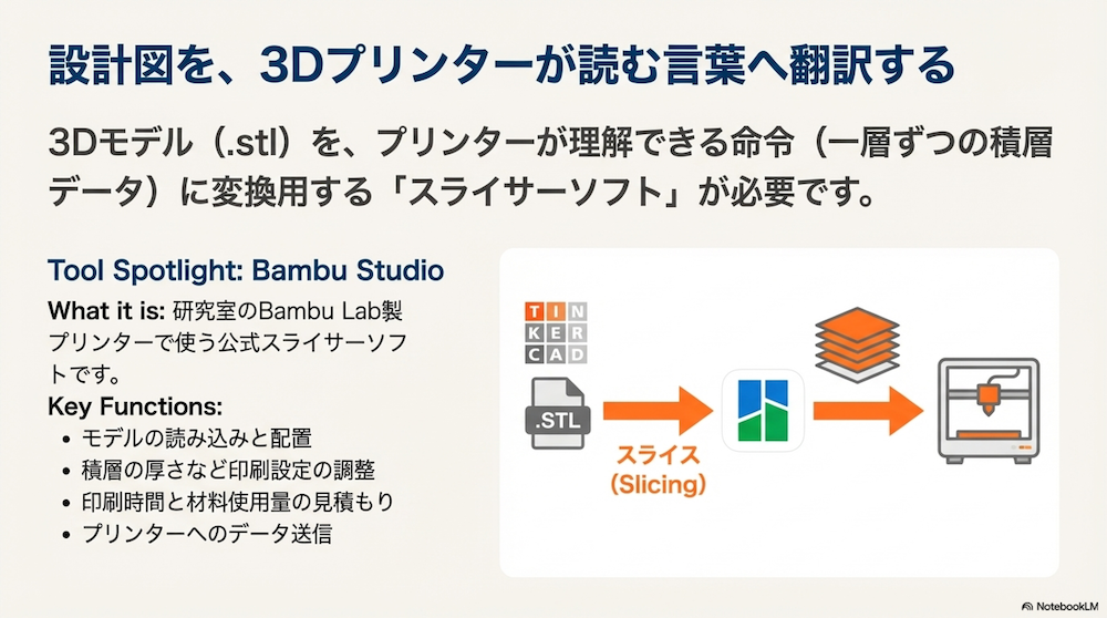 3DプリンターでTinkercadで作ったデータを形にするには、「スライサーソフト」というものを使います。これは、3Dデータを3Dプリンターが理解できる命令に変換するためのソフトです。